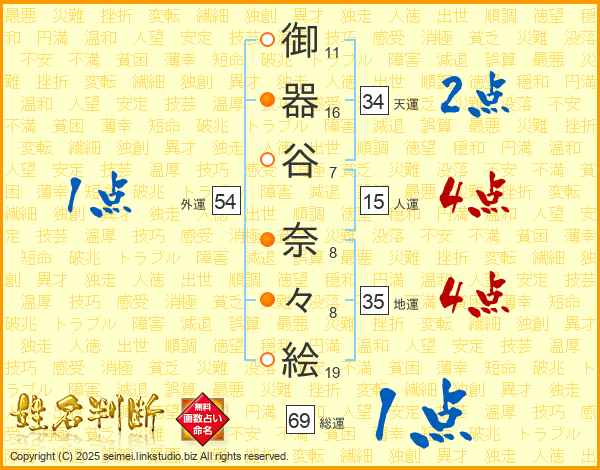 御(11画)器(16画)谷(7画) 奈(8画)々(8画)絵(19画)
