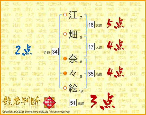 江(7画)畑(9画) 奈(8画)々(8画)絵(19画)