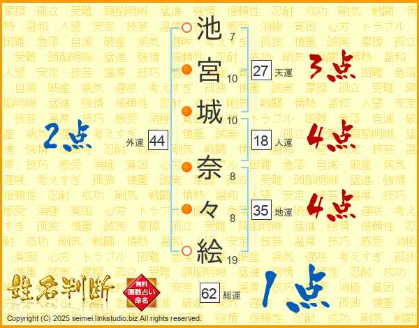 池(7画)宮(10画)城(10画) 奈(8画)々(8画)絵(19画)