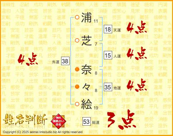 浦(11画)芝(7画) 奈(8画)々(8画)絵(19画)