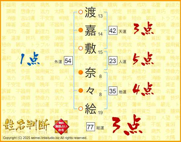 渡(13画)嘉(14画)敷(15画) 奈(8画)々(8画)絵(19画)