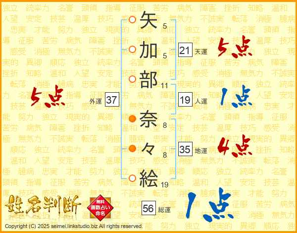 矢(5画)加(5画)部(11画) 奈(8画)々(8画)絵(19画)