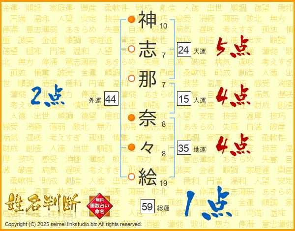 神(10画)志(7画)那(7画) 奈(8画)々(8画)絵(19画)