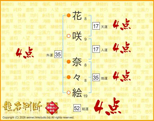 花(8画)咲(9画) 奈(8画)々(8画)絵(19画)