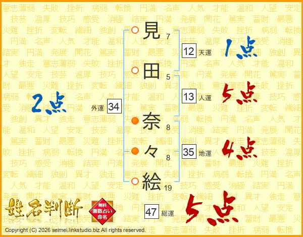 見(7画)田(5画) 奈(8画)々(8画)絵(19画)