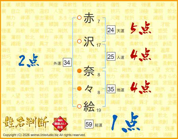赤(7画)沢(17画) 奈(8画)々(8画)絵(19画)