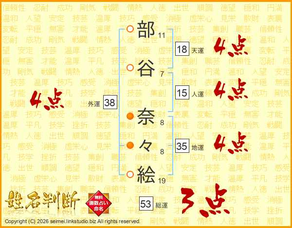 部(11画)谷(7画) 奈(8画)々(8画)絵(19画)