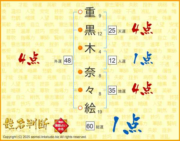 重(9画)黒(12画)木(4画) 奈(8画)々(8画)絵(19画)