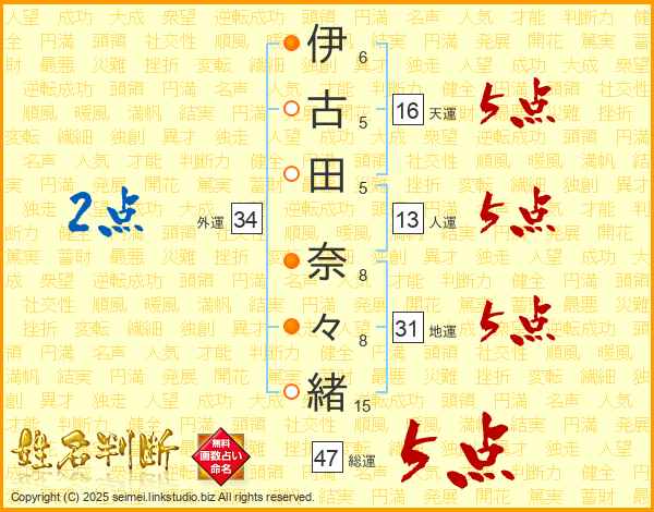 伊(6画)古(5画)田(5画) 奈(8画)々(8画)緒(15画)