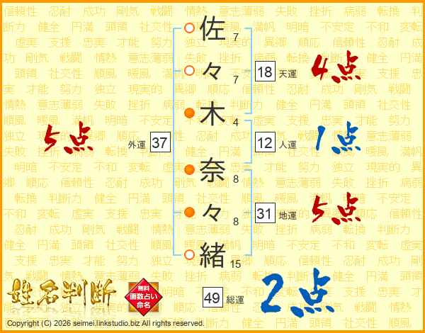 佐(7画)々(7画)木(4画) 奈(8画)々(8画)緒(15画)