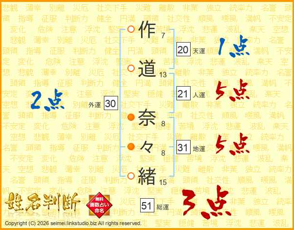 作(7画)道(13画) 奈(8画)々(8画)緒(15画)