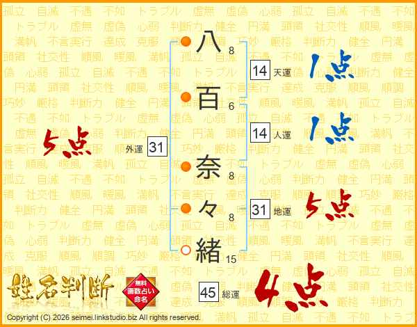 八百奈々緒さんの総運は45画の4点!
