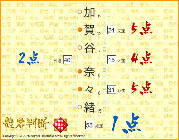 加(5画)賀(12画)谷(7画) 奈(8画)々(8画)緒(15画)
