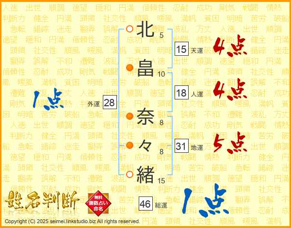 北(5画)畠(10画) 奈(8画)々(8画)緒(15画)