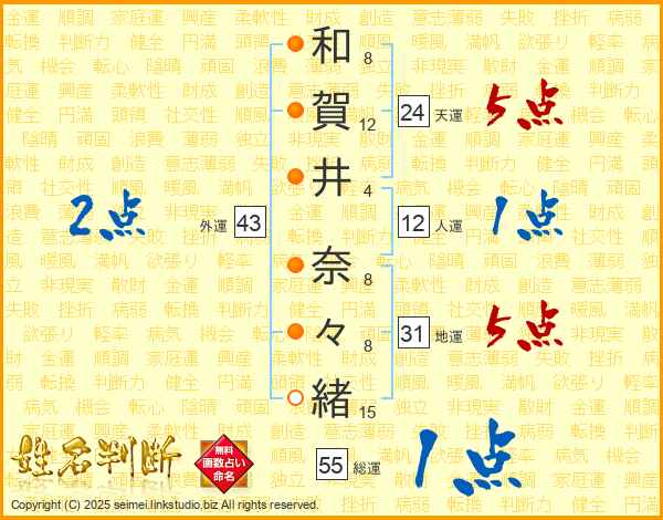 和(8画)賀(12画)井(4画) 奈(8画)々(8画)緒(15画)