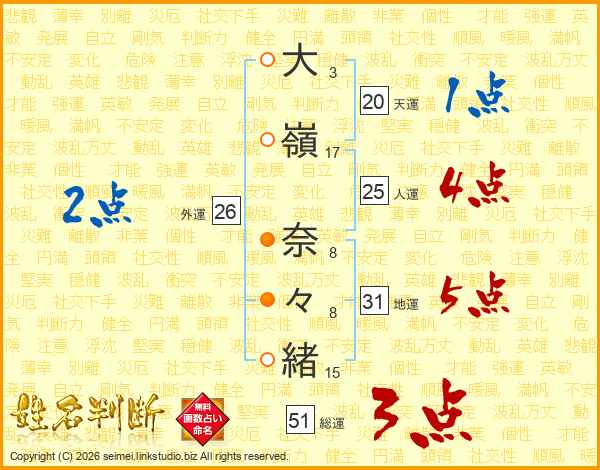 大(3画)嶺(17画) 奈(8画)々(8画)緒(15画)