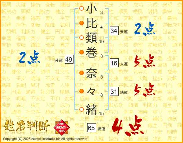 小(3画)比(4画)類(19画)巻(8画) 奈(8画)々(8画)緒(15画)