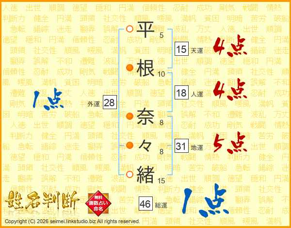平(5画)根(10画) 奈(8画)々(8画)緒(15画)
