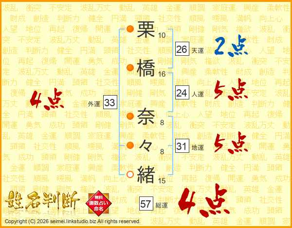栗(10画)橋(16画) 奈(8画)々(8画)緒(15画)