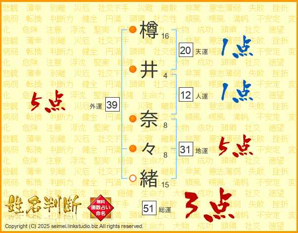 樽(16画)井(4画) 奈(8画)々(8画)緒(15画)