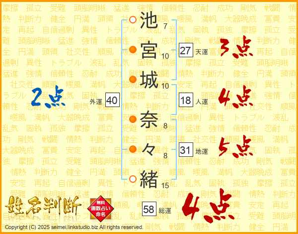 池(7画)宮(10画)城(10画) 奈(8画)々(8画)緒(15画)