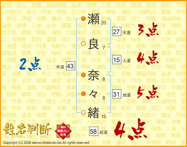 瀬(20画)良(7画) 奈(8画)々(8画)緒(15画)