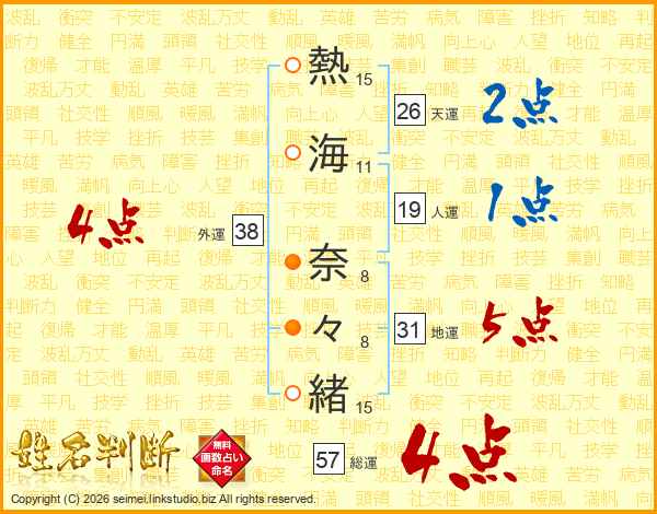 熱(15画)海(11画) 奈(8画)々(8画)緒(15画)