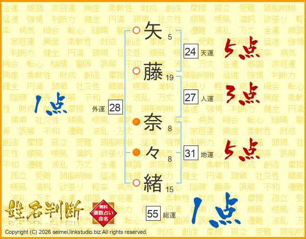 矢藤奈々緒さんの総運は55画の1点!
