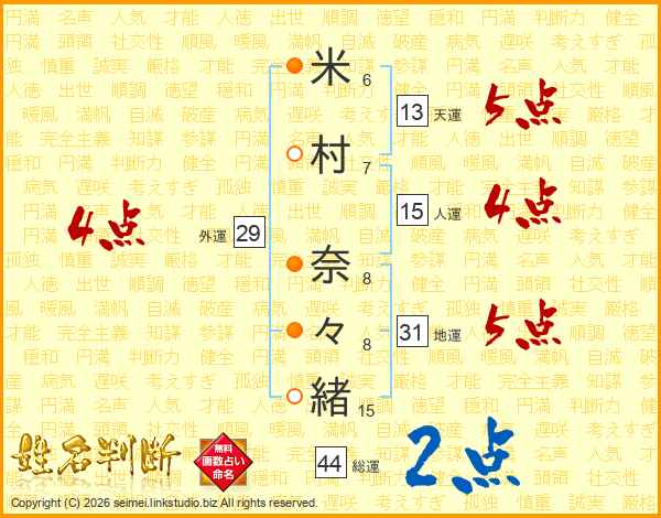 米(6画)村(7画) 奈(8画)々(8画)緒(15画)