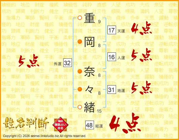 重岡奈々緒さんの地運は31画の5点!