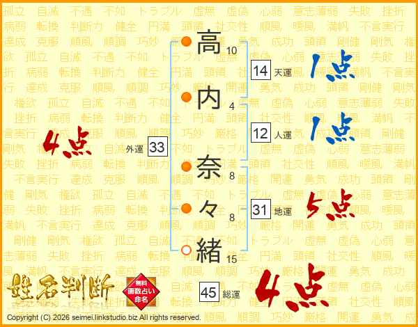 高(10画)内(4画) 奈(8画)々(8画)緒(15画)