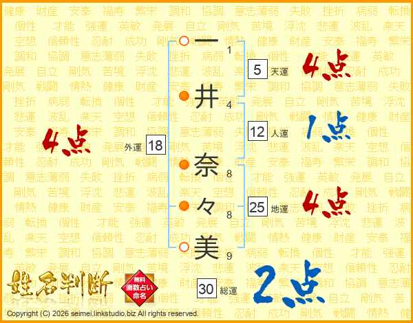 一(1画)井(4画) 奈(8画)々(8画)美(9画)