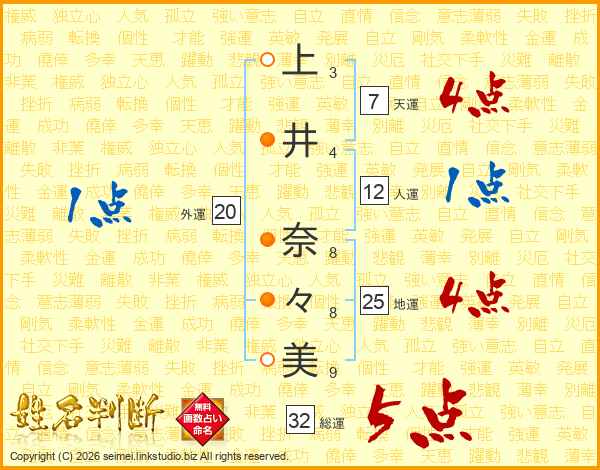 上(3画)井(4画) 奈(8画)々(8画)美(9画)