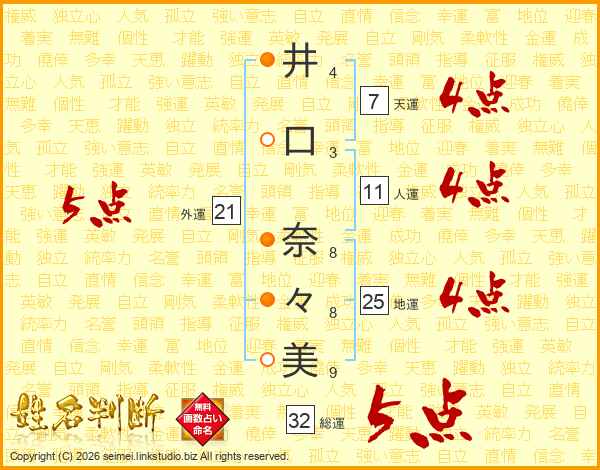 井(4画)口(3画) 奈(8画)々(8画)美(9画)
