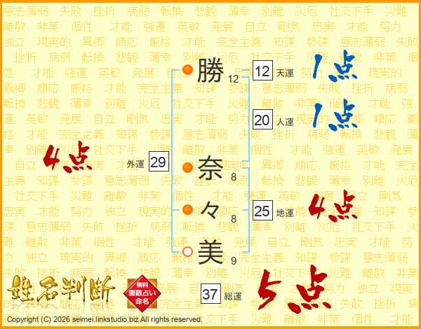 生活面を象徴する運勢です。外部から受ける影響力を表し、結婚運、家庭運や職場、環境への順応性を表します。総運から人運を引いた画数。姓や名が1文字の場合を除く。