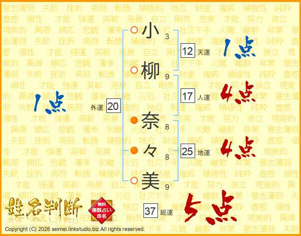 小(3画)柳(9画) 奈(8画)々(8画)美(9画)