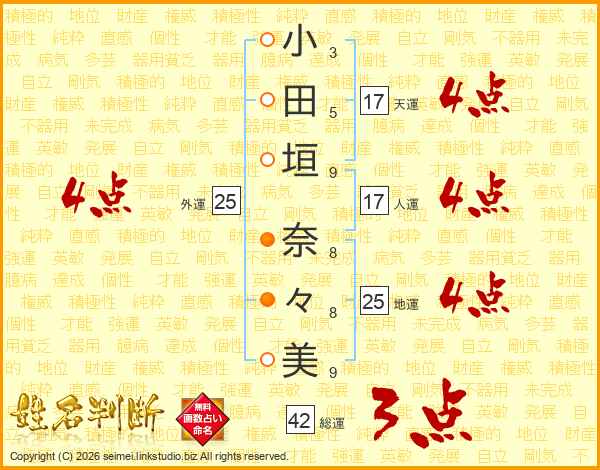 小(3画)田(5画)垣(9画) 奈(8画)々(8画)美(9画)