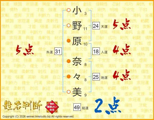 小(3画)野(11画)原(10画) 奈(8画)々(8画)美(9画)