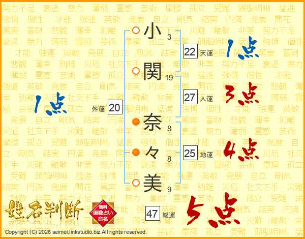小(3画)関(19画) 奈(8画)々(8画)美(9画)