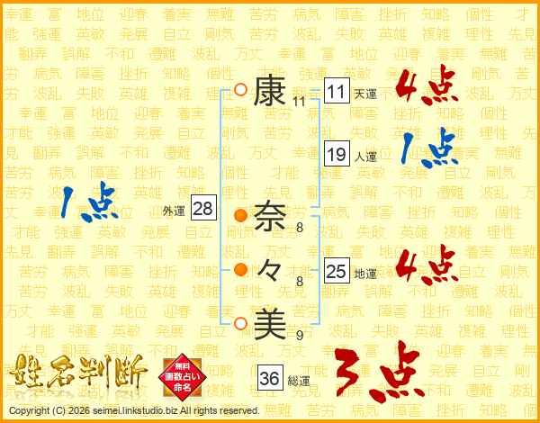 康(11画) 奈(8画)々(8画)美(9画)