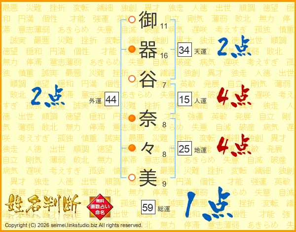 御(11画)器(16画)谷(7画) 奈(8画)々(8画)美(9画)