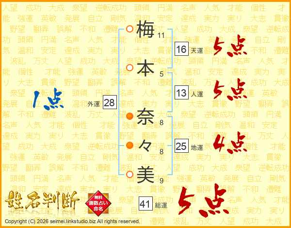 梅(11画)本(5画) 奈(8画)々(8画)美(9画)