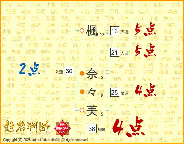 楓(13画) 奈(8画)々(8画)美(9画)