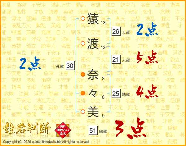 猿(13画)渡(13画) 奈(8画)々(8画)美(9画)