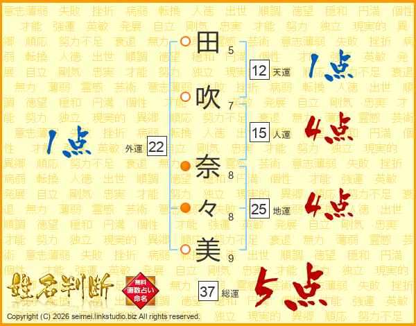 田(5画)吹(7画) 奈(8画)々(8画)美(9画)