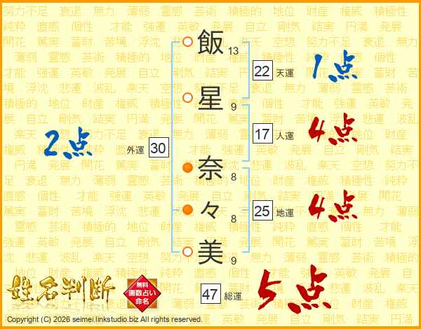 飯(13画)星(9画) 奈(8画)々(8画)美(9画)
