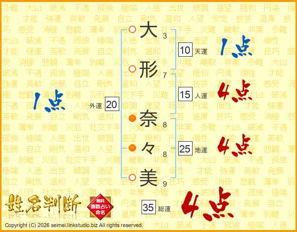 大(3画)形(7画) 奈(8画)々(8画)美(9画)