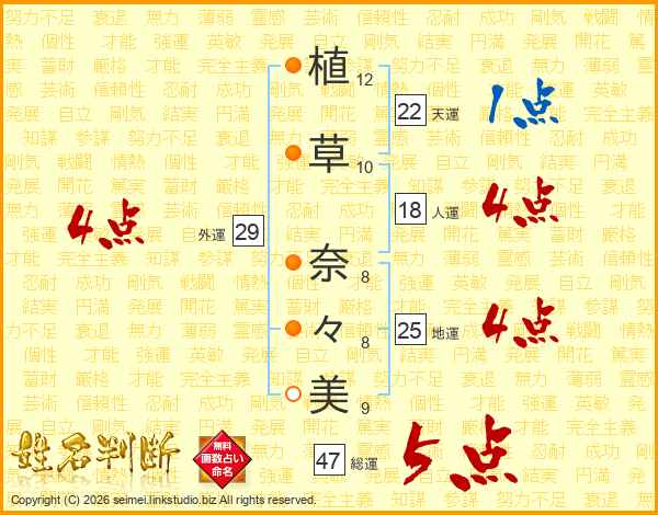 植(12画)草(10画) 奈(8画)々(8画)美(9画)