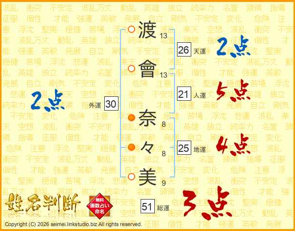 渡(13画)會(13画) 奈(8画)々(8画)美(9画)