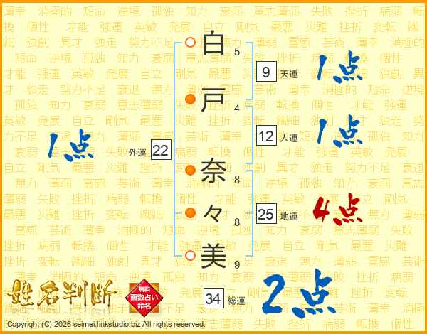 白(5画)戸(4画) 奈(8画)々(8画)美(9画)